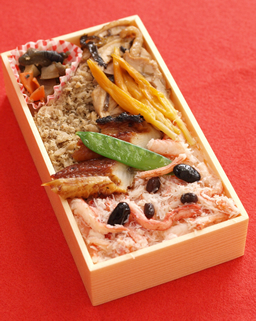 出雲大社大遷宮と古事記編纂1300年を記念し、作り上げたお弁当です。 お料理材料も、出雲大社から、朝廷に献上された「金針菜(ユリの花)」や、古事記にある五穀豊穣にちなんだ「米、麦、粟、黒豆、小豆」、また、日本海産「紅ズワイガニ・昆布・アゴでんぶ(トビウオ)、あなご」など、出雲大社に関係の深い材料を盛り込んでいます。醤油は、奥出雲で150年間使い続けた醤油木樽から生まれた本醸造醤油「古式醤油」、酒は松江の「出雲地伝酒」など、調味料にもこだわっています。
